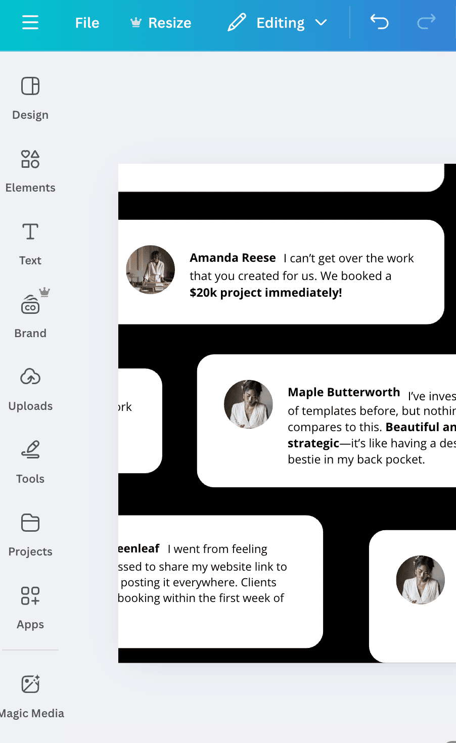 Grab our free Canva Testimonial Template! It’s beautifully designed, totally customizable, and crazy easy to use—just copy, paste, and swap in your client’s words. Perfect for Instagram, websites, or emails, this template helps you turn glowing reviews into scroll-stopping social proof (and more bookings!) in minutes.
